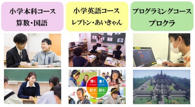 算数では学校の教科書に準拠したワーク、国語・英語では個々の習熟度別に学習できる「無学年進級式」を採用。